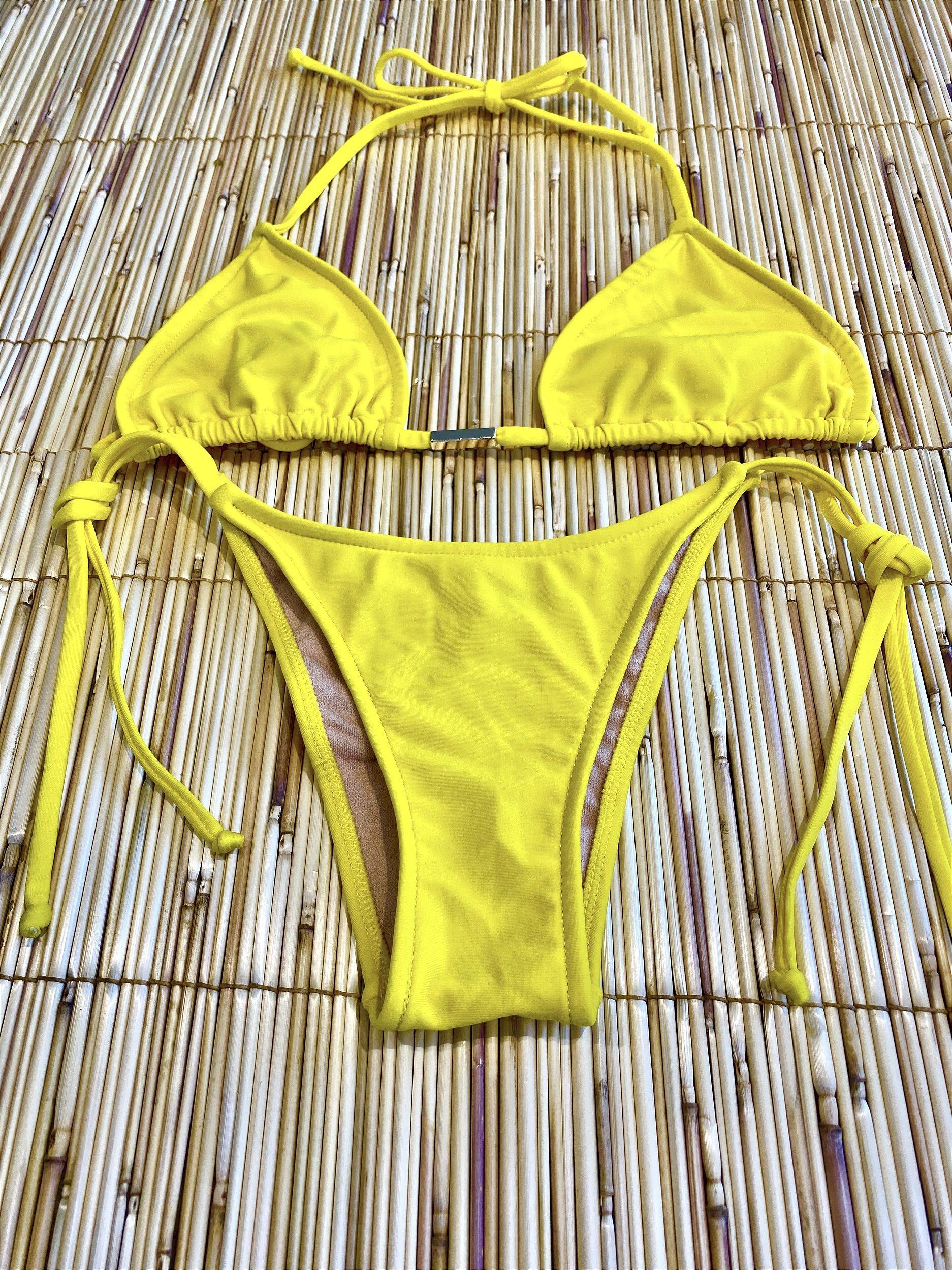Biquíni calcinha lacinho com sutiã cortininha sem bojo (mas possui uma abertura para colocar um bojo removível) . Na lycra amarela . Com ferragens douradas . Calcinha empina bumbum
