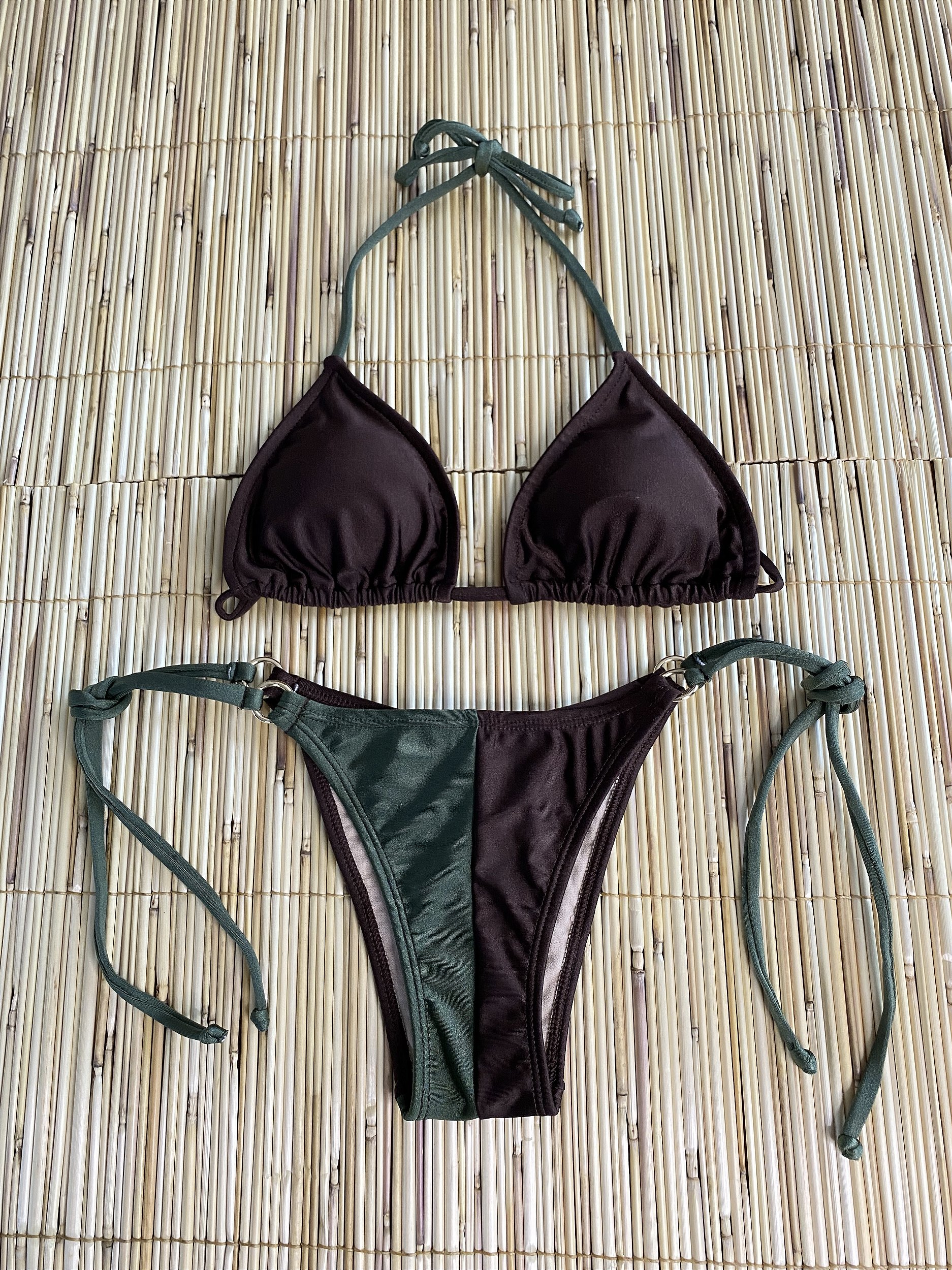 Biquíni modelo calcinha lacinho com sutiã cortininha com bojo removível . Na lycra cirrê marrom e verde musgo . Com ferragens douradas . Calcinha empina bumbum . Sutiã marrom