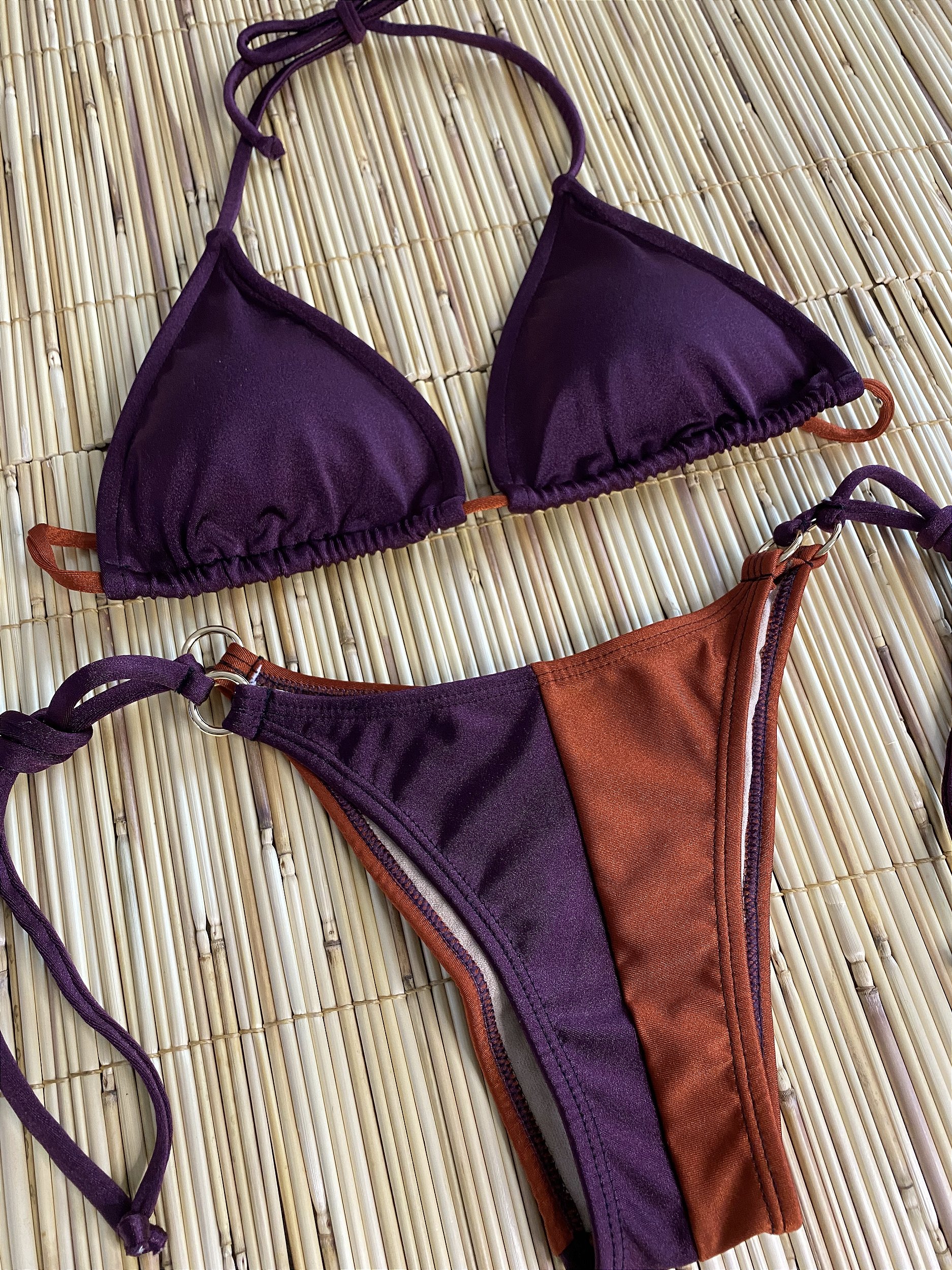 Biquíni modelo calcinha lacinho com sutiã cortininha com bojo removível . Na lycra cirrê beterraba e terracota . Com ferragens douradas . Calcinha empina bumbum . Sutiã beterraba