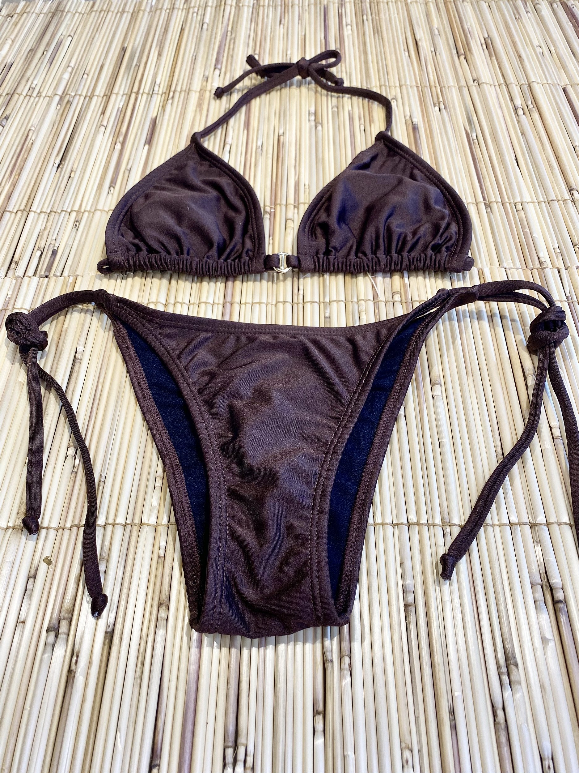 Biquíni calcinha lacinho com sutiã cortininha sem bojo (mas possui uma abertura para colocar um bojo removível) . Na lycra marrom . Com ferragens douradas . Calcinha empina bumbum